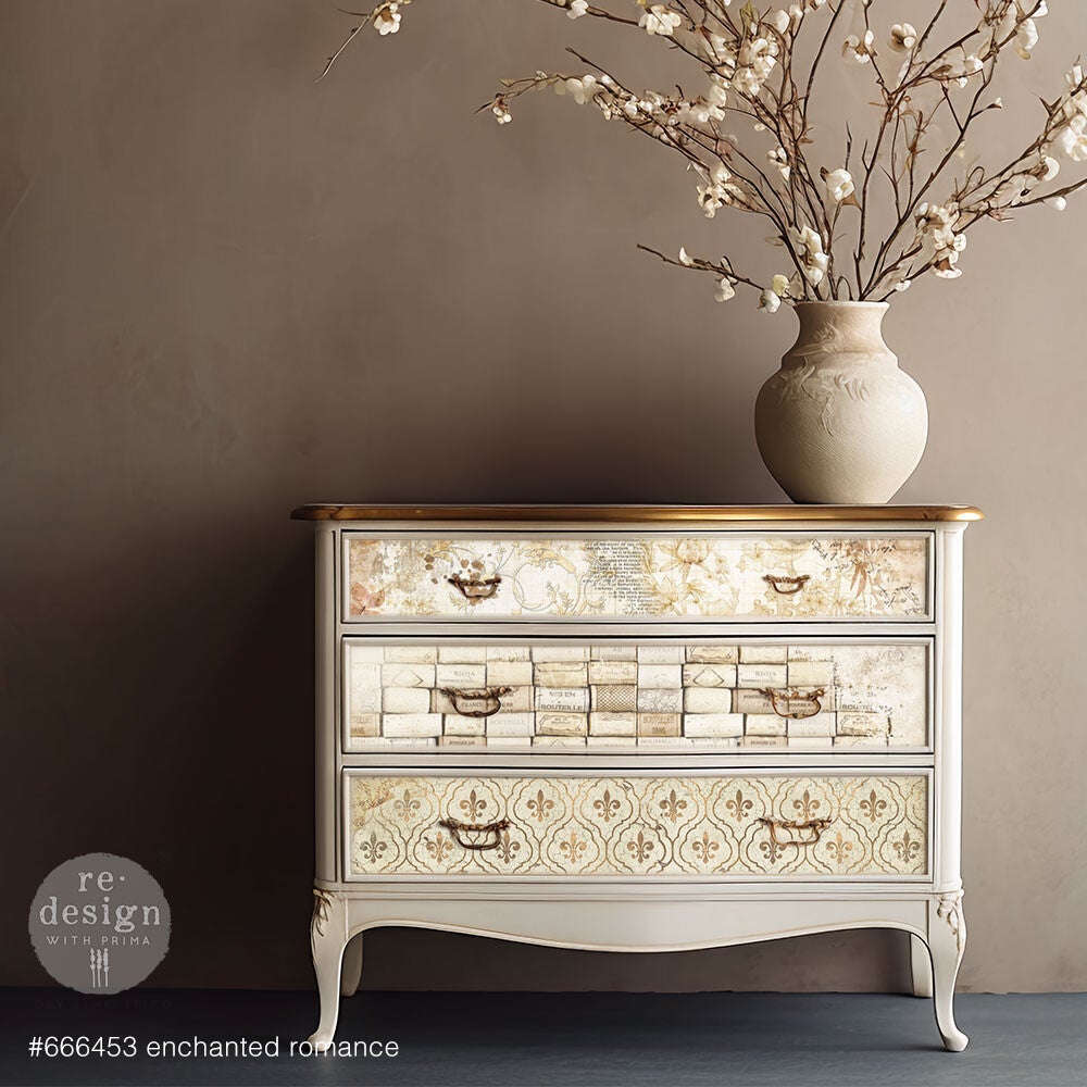 Drie keer zoveel plezier! Introductie van NIEUWE Redesign met Prima® Découpage Paper Triple Packs, met drie prachtige ontwerpen die perfect zijn samengesteld om te mixen en matchen voor uw volgende doe-het-zelfproject! "Enchanted Romance" biedt drie vellen met een romantische en elegante esthetiek die perfect is voor het maken van projecten met een vleugje betovering. De romige witte en linnen tinten vormen een zachte, delicate achtergrond voor mooie losse bloemen, een verzameling vintage kurken en een mooi fleur-de-lis-ontwerp. Laat uw fantasie de vrije loop terwijl u deze elementen verwerkt in uw artistieke creaties voor een betoverende romantiek! De duurzaamheid van Redesign's Decoupage Paper zorgt ervoor dat uw decoupageproject jarenlang meegaat. Het papier is bestand tegen scheuren en vervagen, waardoor het prachtige ontwerp levendig en mooi blijft, zelfs bij regelmatig gebruik.