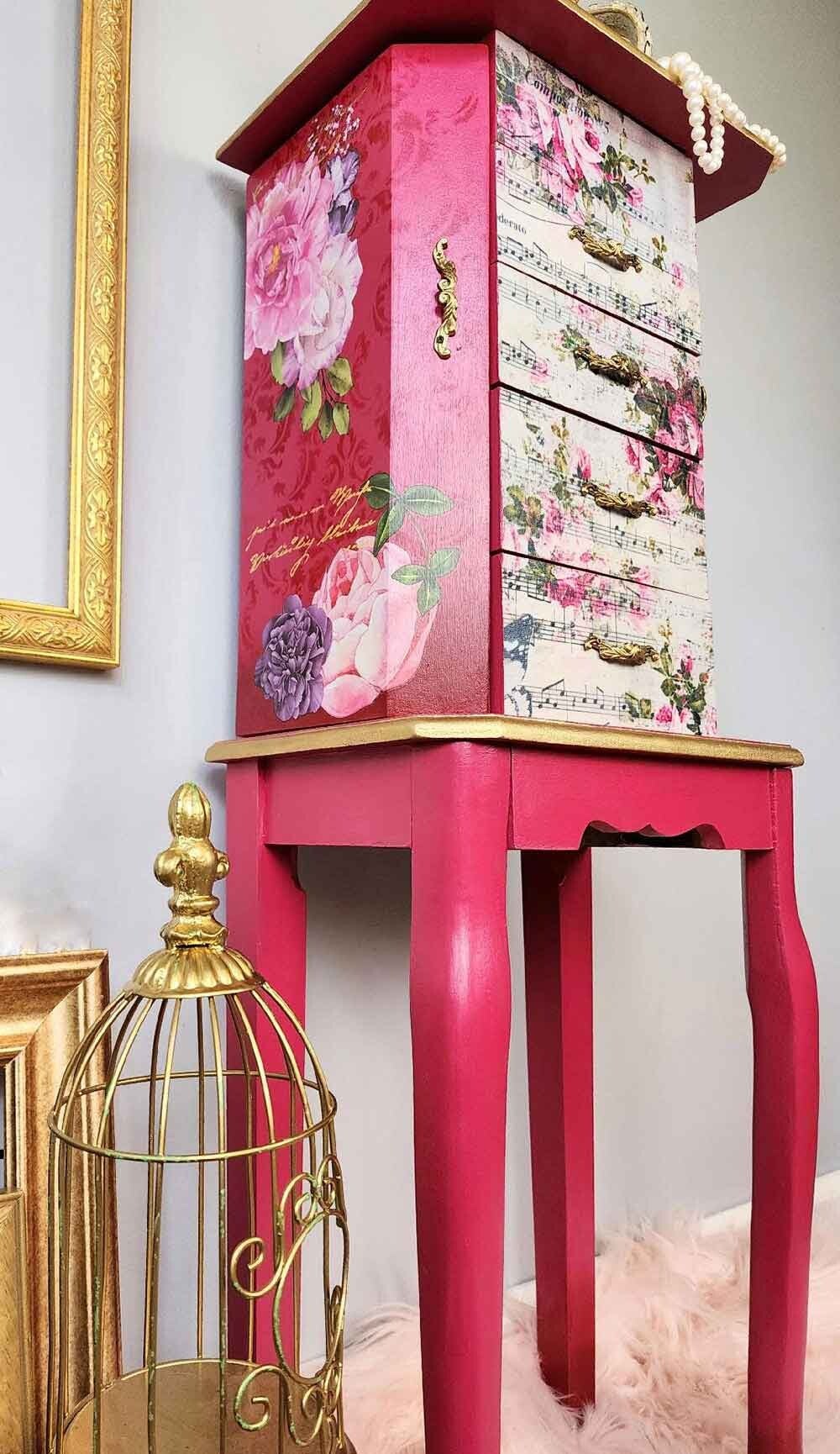 - Laat het meubel volledig drogen voordat je het in gebruik neemt. Met deze stappen kun je je meubel een prachtige nieuwe look geven met decoupage papier van Redesign! Voor het vernissen kan je er nog voor kiezen om eventueel de prent weg te werken om er een deel over te schilderen zodat de kleuren in een vloeien en het 1 geheel word.