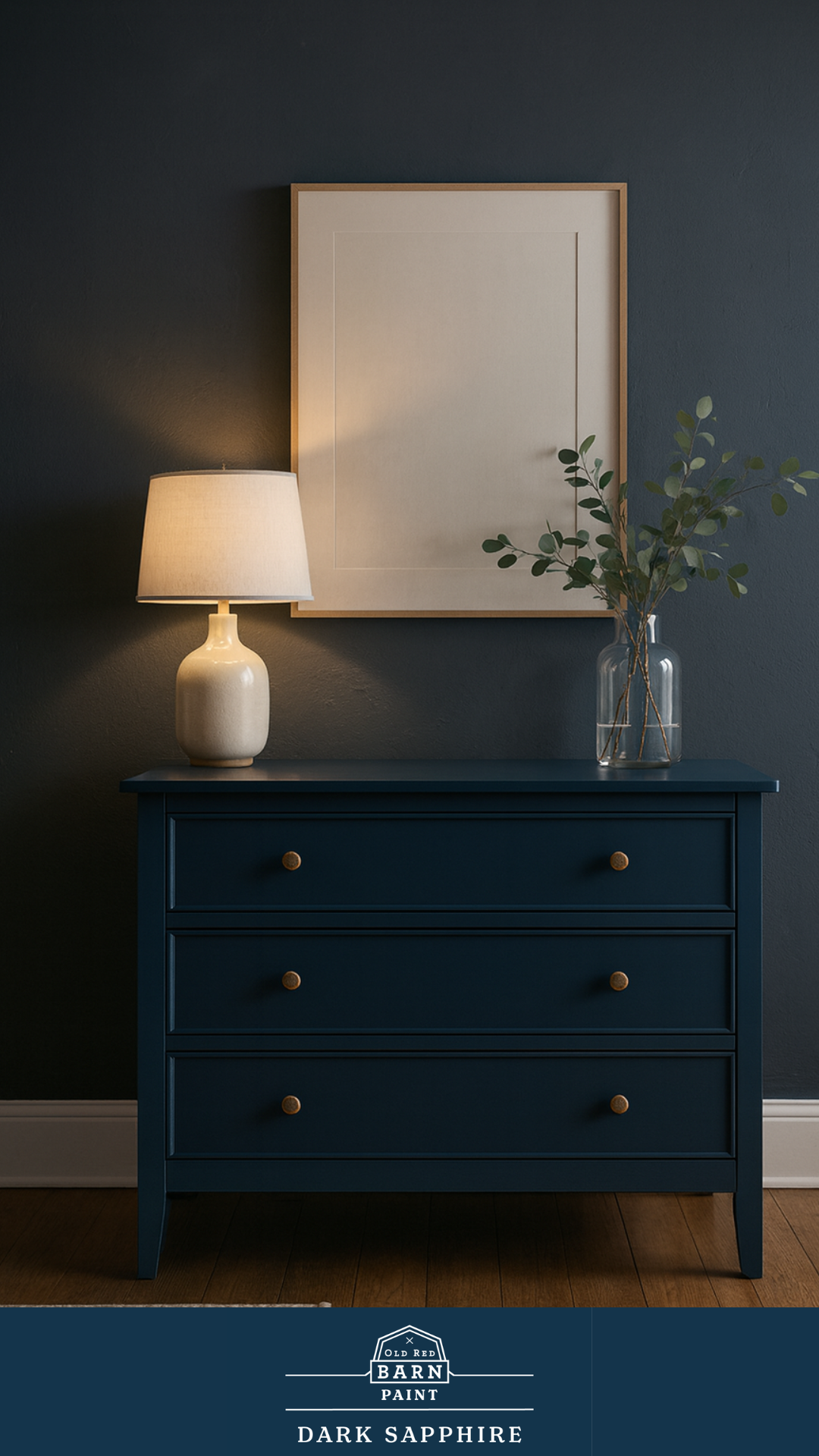 Dark Sapphire van Old Red Barn PAINT is de kleur van avondlijke elegantie — een diep, inktachtig blauw met een fluweelzachte diepte die doet denken aan de rijkdom van de edelsteen waarnaar hij vernoemd is. Deze verfijnde tint ademt rust, zelfvertrouwen en tijdloze klasse, en brengt een vleugje mysterie in elk interieur.